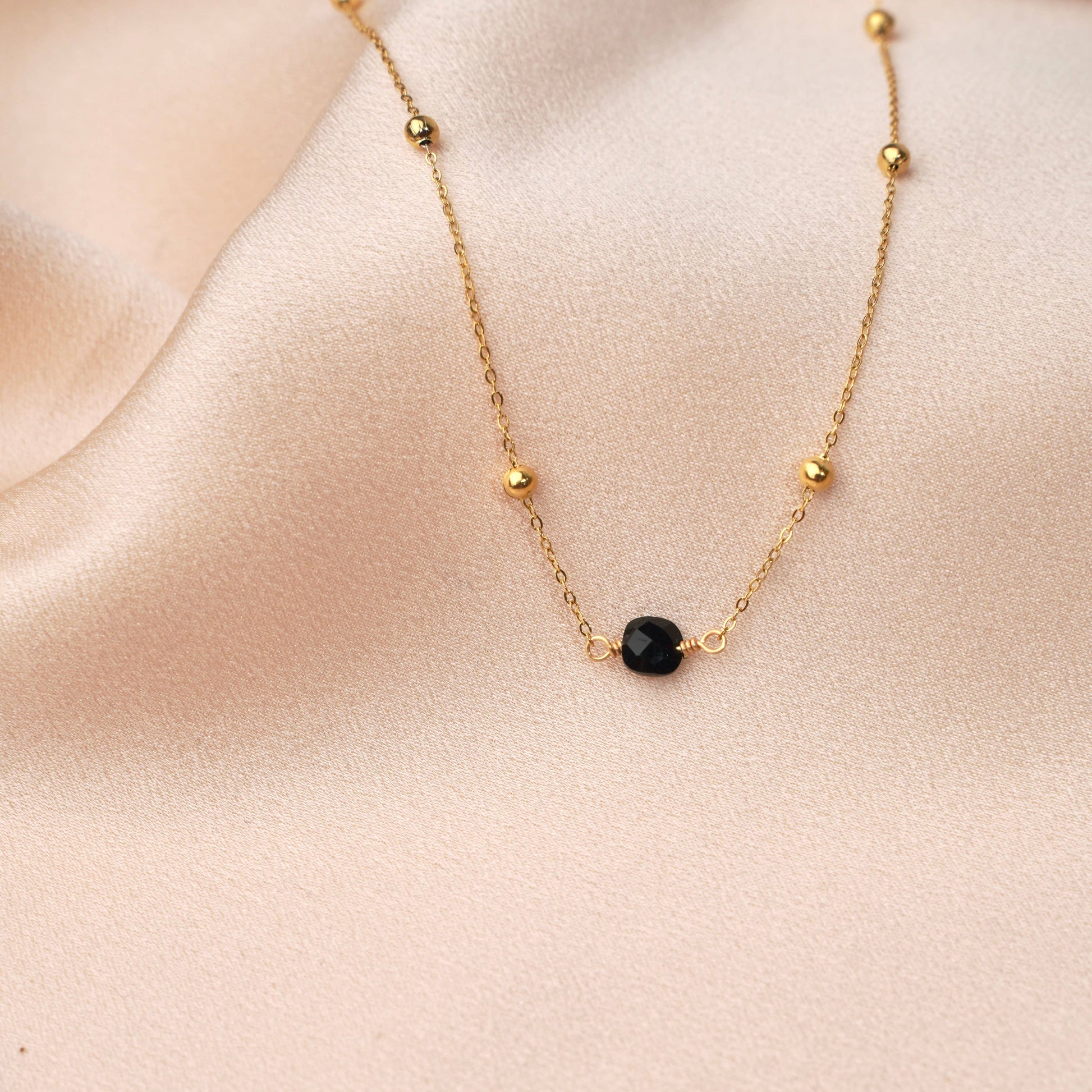 Damenhalskette mit einer feinen Edelstahl-Kugelkette und einem kleinen quadratischen Naturstein, der ein Lapislazuli ist. Minimalistisch und schick, ist es perfekt zum Verschenken! Diese Halskette passt sehr gut zu anderen Goldhalsketten.