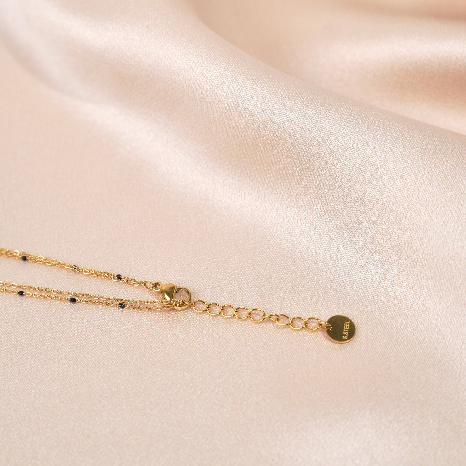 Dieses Damenarmband besteht aus zwei feinen Edelstahlketten, darunter eine Präsenz, ein Halbedelstein, Onyx, ein Synonym für Weichheit und Beschwichtigung. Das Armband hat eine kleine Verstellkette von 3 cm, sodass es an die Größe Ihres Handgelenks angepasst ist. Einzelheiten: Länge des Armbands: 15,5 cm + 3 cm Verstellkette